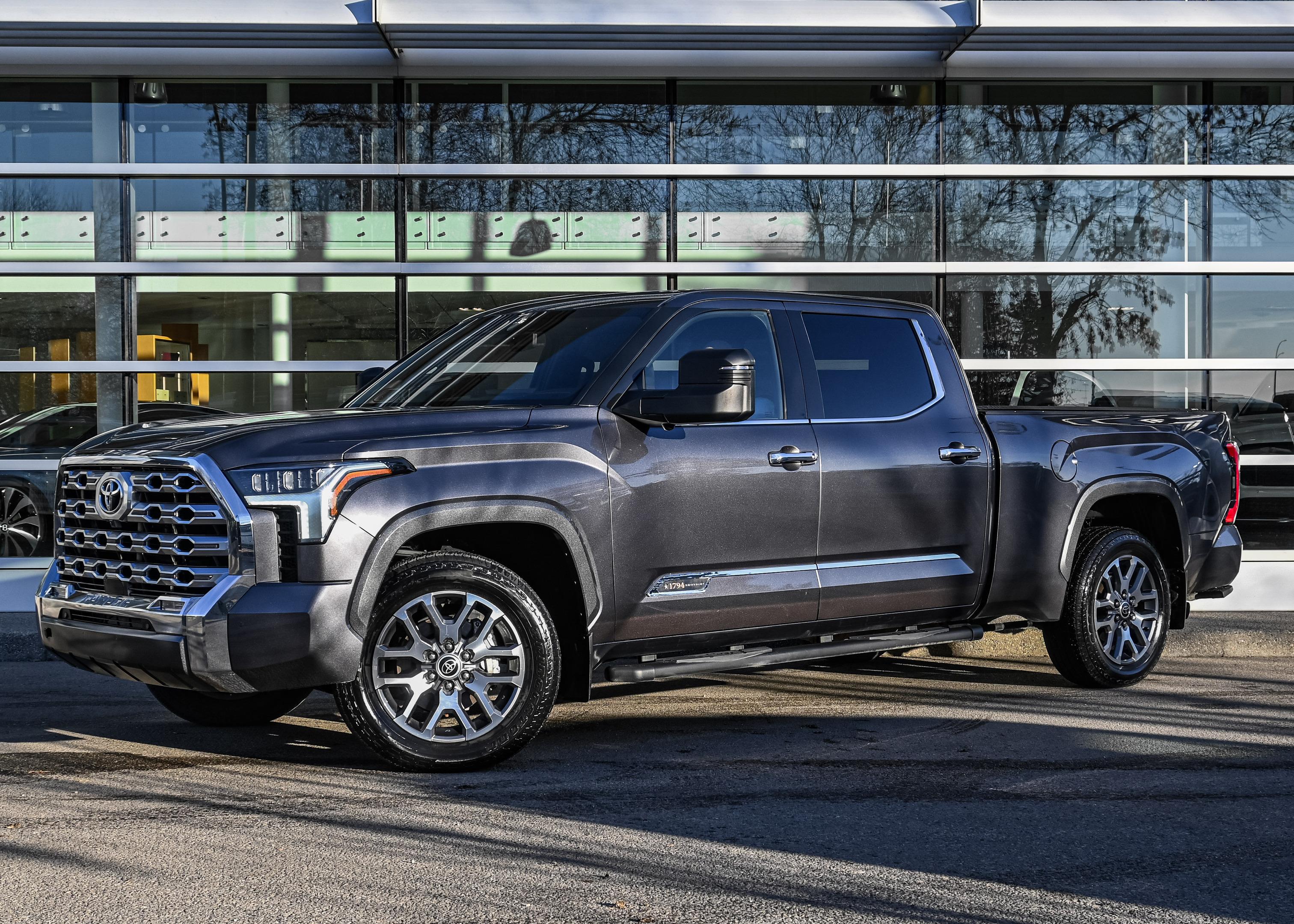 Low KM Tundra Platinum 1794 Edition Hybrid with 6.5ft Box option. Magnetic Grey over Saddle Tan. Fully optioned with Heated and Ventilated Seats front and rear, Massage Front Seats, JBL Premium Audio, Panorama Sunroof, 20"" wheels, retractable tow mirrors, remote start and much more. Excellent condition. Comes with roll up box cover and full winter mats pkg.